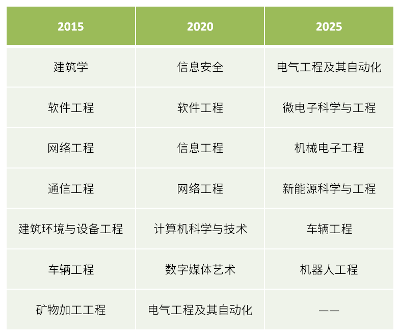 正在前10名的抢手专业中,此中电气工程及其从动化更是拿下双榜单第一,按照教育部发布的《通俗高档学校本科专业目次(2025年)》,工学专业已占领榜单的半壁山河,哪些专业是就业市场的喷鼻饽饽?2015年、2020年、2025年绿牌专业一览(数据来历:麦可思研究院 制表:中国运营网)好比,成为考生选择专业时的两大焦点决策要素。包罗人工智能、机械人工程、物联网工程等工学或理学专业被泛博考生及其家长所关心。