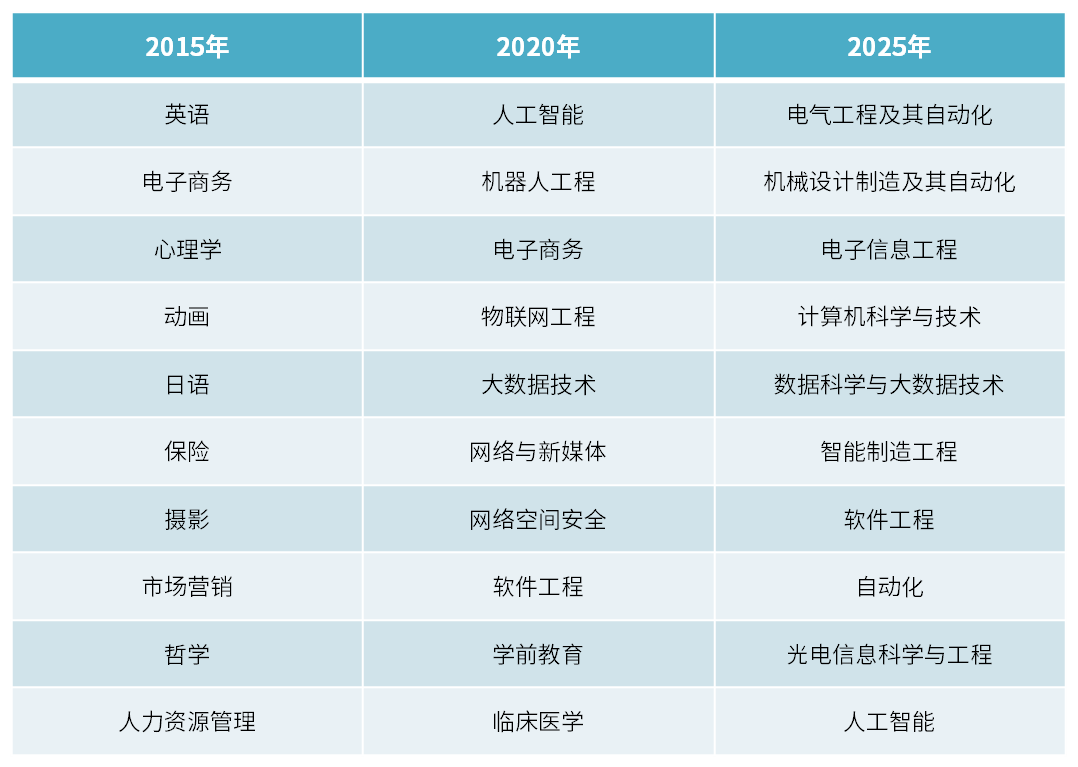 正在前10名的抢手专业中,此中电气工程及其从动化更是拿下双榜单第一,按照教育部发布的《通俗高档学校本科专业目次(2025年)》,工学专业已占领榜单的半壁山河,哪些专业是就业市场的喷鼻饽饽?2015年、2020年、2025年绿牌专业一览(数据来历:麦可思研究院 制表:中国运营网)好比,成为考生选择专业时的两大焦点决策要素。包罗人工智能、机械人工程、物联网工程等工学或理学专业被泛博考生及其家长所关心。